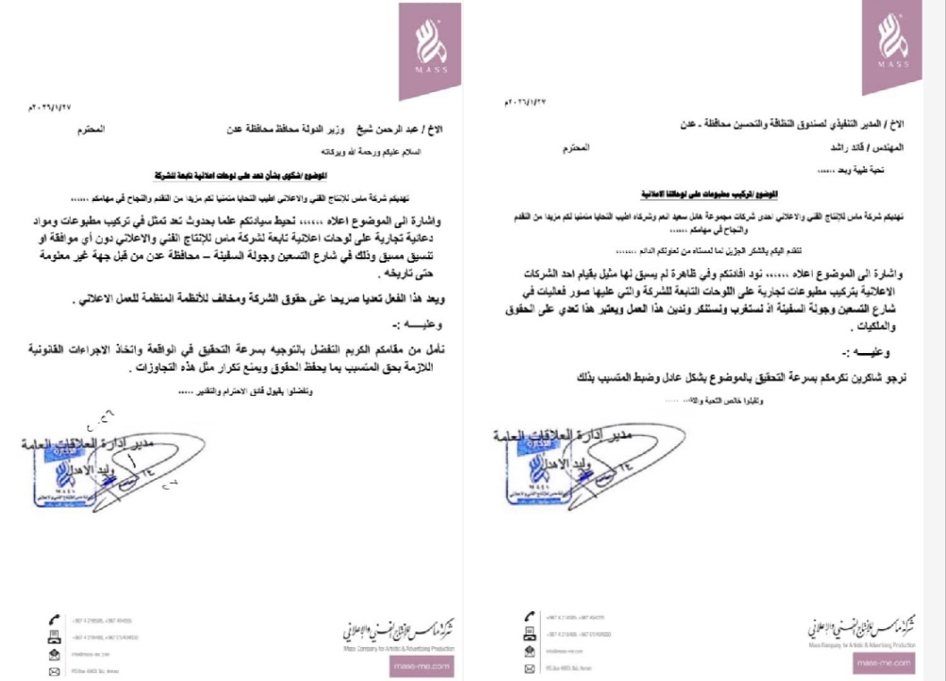 كشفت وثيقة رسمية صادرة عن شركة ماس للإنتاج الفني والإعلاني عن تعرض عدد من لوحاتها الإعلانية في محافظة عدن لتعدٍّ غير قانوني، تمثل في تركيب إعلان لمنتج كوستر كلاركس فوق اللوحات الأصلية، دون أي إذن أو تنسيق مسبق مع الشركة المالكة.