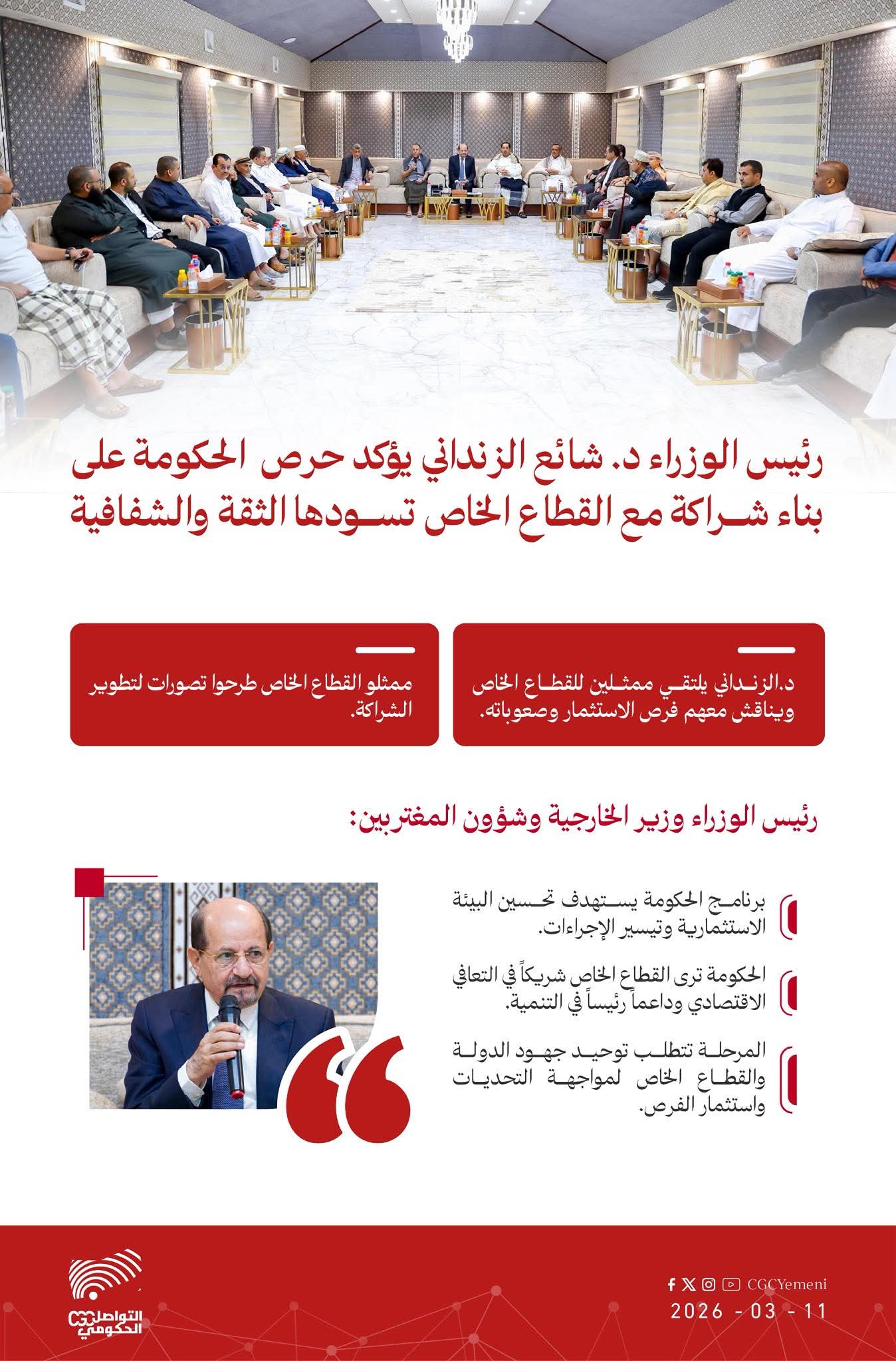 أعاد رئيس الوزراء الدكتور شائع الزنداني التذكير بحرص الحكومة على إرساء شراكة حقيقية مع القطاع الخاص