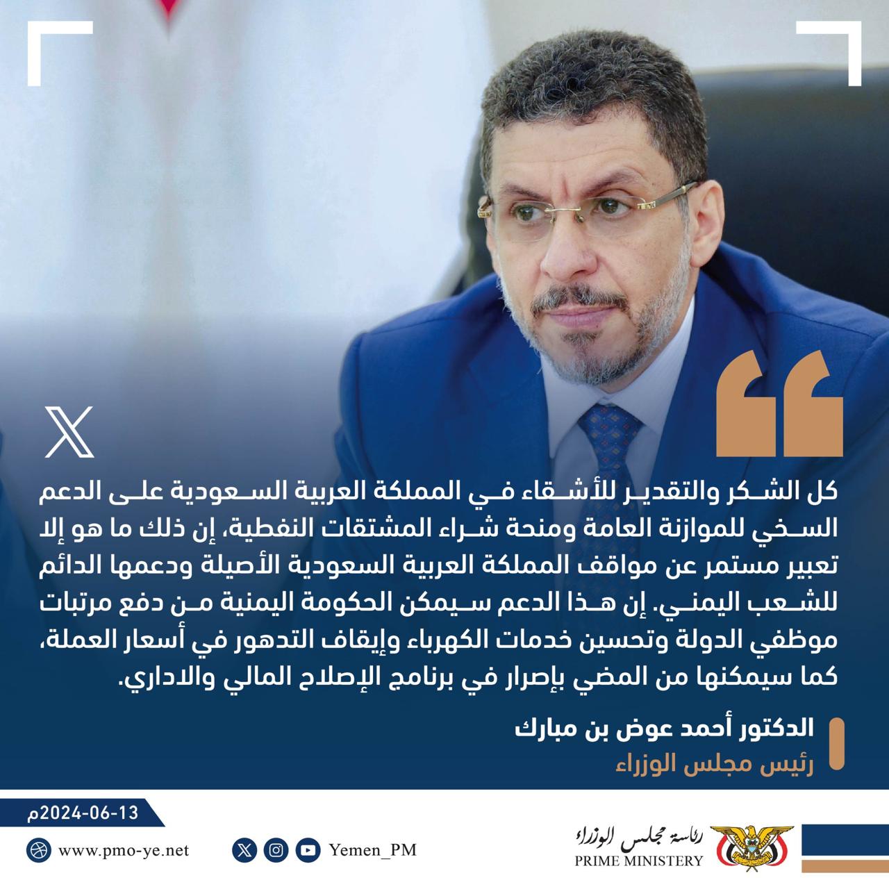 وفي تغريدة على حسابة في منصة(x)، قال رئيس مجلس الوزراء: “إن هذا الدعم سيمكن الحكومة اليمنية من دفع مرتبات موظفي الدولة وتحسين خدمات الكهرباء وإيقاف التدهور في أسعار العملة، كما سيمكنها من المضي بإصرار في برنامج الإصلاح المالي والإداري”.