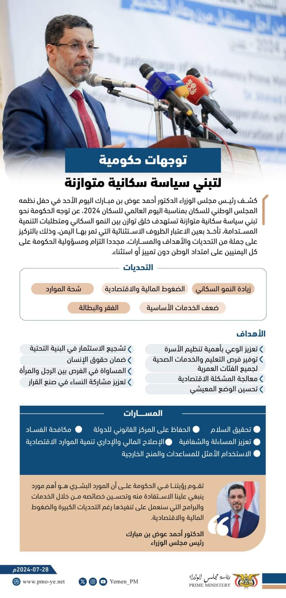 إنفوجرافيك || توجه حكومي نحو تبني سياسة سكانية متوازنة تستهدف خلق توازن بين النمو السكاني ومتطلبات التنمية المستدامة، تأخذ بعين الاعتبار الظروف الاستثنائية التي تمر بها اليمن، وذلك بالتركيز على جملة من التحديات والأهداف والمسارات.