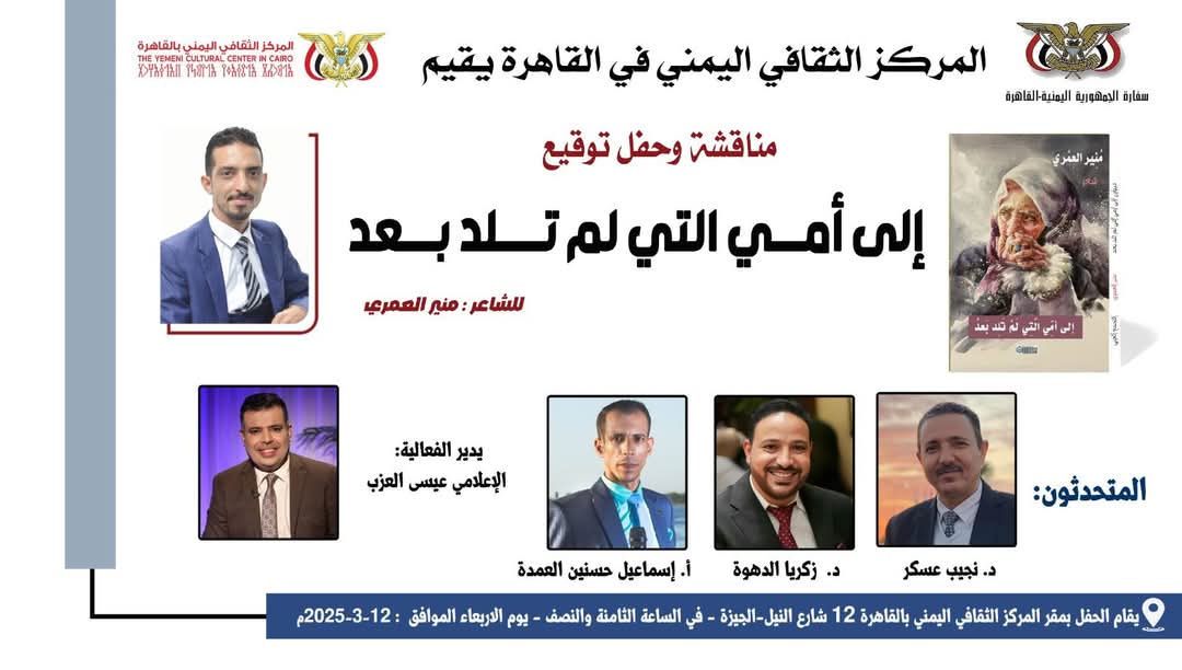يستضيف المركز الثقافي اليمني في القاهرة، يوم الأربعاء المقبل (الموافق 12 مارس – الساعة 8:30 مساءً)، حفل توقيع ديوان “إلى أمي التي لم تلد بعد” للشاعر والإعلامي اليمني منير العمري، والصادر عن التجمع العربي للطباعة والنشر والتسويق.