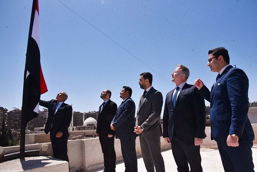 وقام رئيس الوفد اليمني الزائر لدمشق برئاسة السفير عبدالله الدعيس، ومعه، القائم بأعمال السفارة اليمنية بالنيابة في دمشق، المستشار محمد بعكر، برفع علم الجمهورية اليمنية على سارية السفارة.