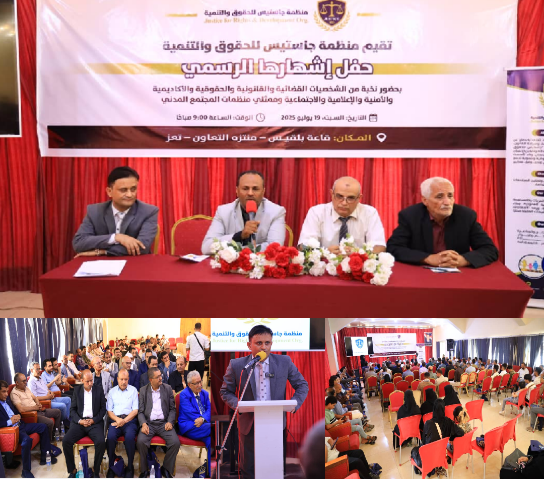 في خطوة وُصفت بالمهمة لتعزيز قيم العدالة والتنمية في محافظة تعز، أُعلن صباح اليوم السبت، عن إشهار منظمة “جاستيس للحقوق والتنمية”، كمنظمة مدنية مستقلة تهدف إلى تمكين الإنسان، ودعم سيادة القانون، وبناء شراكات فاعلة بين مؤسسات الدولة والمجتمع المدني.
