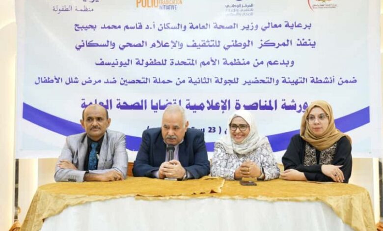 من جانبه أوضح المدير العام للمركز الوطني للتثقيف والإعلام الصحي والسكاني الدكتور عارف الحوشبي، أن تنظيم هذه الورشة يأتي في إطار أنشطة المركز الهادفة إلى الحشد والمناصرة للقضايا الصحية العامة والطارئة وفي مقدمتها حملات التحصين ضد شلل الأطفال.
