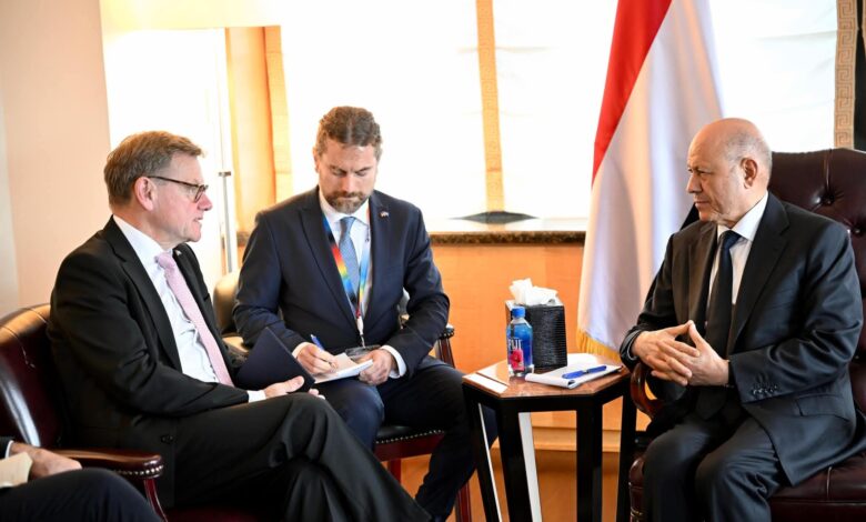 وفي اللقاء اشاد رئيس مجلس القيادة الرئاسي بموقف جمهورية المانيا الاتحادية الى جانب الشعب اليمني، وقيادته السياسية، معربا عن تطلعه الى مضاعفة التدخلات الاقتصادية والانمائية، والانسانية، لتحسين موقف العملة الوطنية والاوضاع المعيشية والخدمات الاساسية، واستكمال جهود الاصلاحات الشاملة.