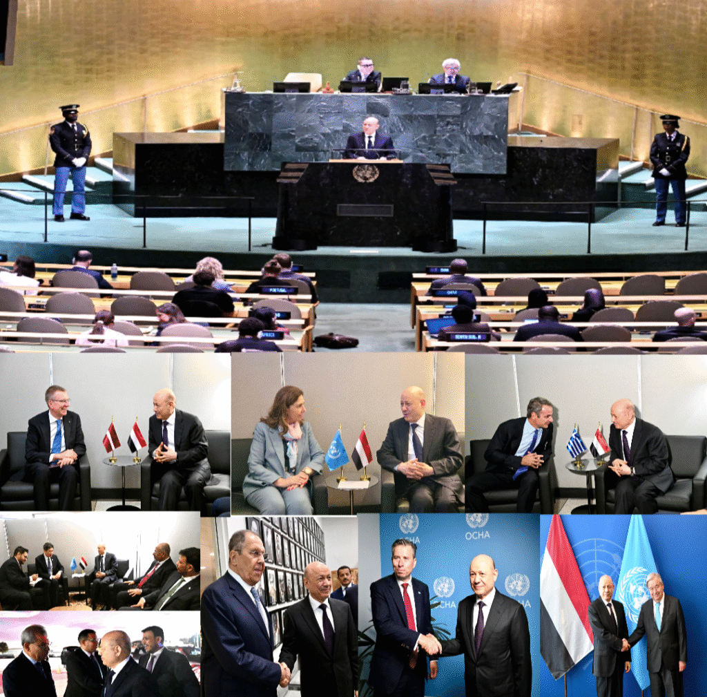 إلى جانب ذلك، عقد الرئيس العليمي لقاءات مكثفة مع شخصيات أممية ودولية في إطار استراتيجية متكاملة لتعزيز الحضور اليمني. فمع الأمين العام للأمم المتحدة أنطونيو غوتيريش، ناقش سبل حماية موظفي المنظمة ونقل مقراتها إلى عدن، وضمان بيئة آمنة لعملها الإنساني، فضلًا عن الإفراج عن المحتجزين لدى المليشيات الحوثية.
