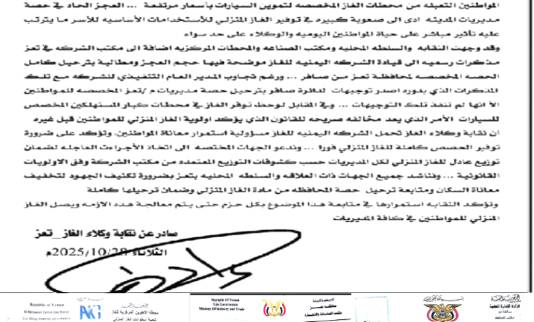 من جانبه، رفع مدير مكتب الصناعة والتجارة عبدالرحمن القليعة، مذكرة مماثلة إلى المحافظ، أوضح فيها أن الكمية المخصصة لمحطة الأخوين خلال الأشهر الثلاثة الماضية بلغت 175 مقطورة، إلا أن ما تم ترحيله فعلياً لا يتجاوز 102 مقطورة، بعجز يصل إلى 73 مقطورة، ما تسبب في تفاقم أزمة الغاز المنزلي وخلق اختناقات متصاعدة.