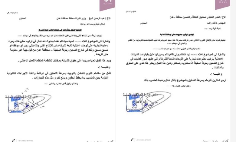 كشفت وثيقة رسمية صادرة عن شركة ماس للإنتاج الفني والإعلاني عن تعرض عدد من لوحاتها الإعلانية في محافظة عدن لتعدٍّ غير قانوني، تمثل في تركيب إعلان لمنتج كوستر كلاركس فوق اللوحات الأصلية، دون أي إذن أو تنسيق مسبق مع الشركة المالكة.