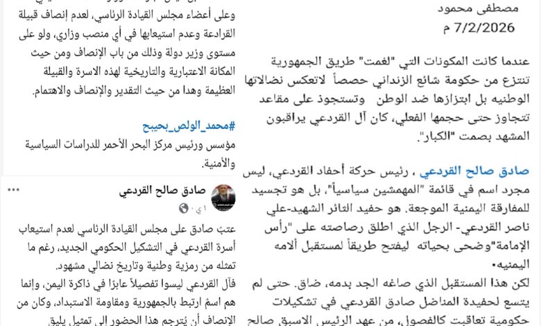 وأكد الخبراء والمحللون أن تجاهل رموز النضال الجمهوري يمثل تهديدًا لمصداقية الدولة ويثير تساؤلات حول مدى التوازن السياسي، مؤكدين أن إدراج رموز تاريخية مثل آل القردعي في مواقع القرار يعكس احترام المبادئ الوطنية، ويترجم الشراكة الحقيقية بين مكونات المجتمع، بما يضمن استقرار العملية السياسية ويعزز قيم الجمهورية والعدالة الوطنية.