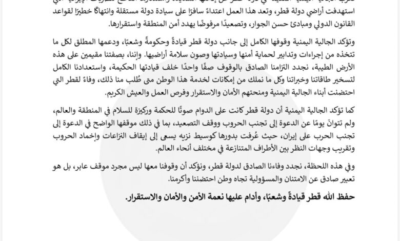 مجلس الجالية اليمنية في قطر يدين الاعتداءات الإيرانية ويؤكد تضامنه الكامل مع الدولة