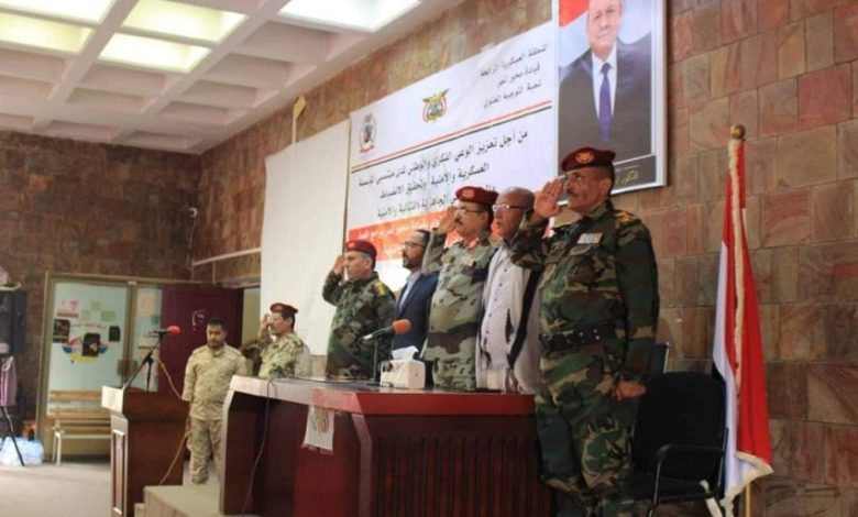 وأكد رئيس أركان محور تعز، أهمية الإنضباط والجاهزية القتالية لدى منتسبي المؤسستين العسكرية والأمنية، قائلا: إن الجيش والأمن هما صمام أمان الوطن”، مشيداً بوعي منتسبي الجيش والأمن، وإيمانهم بقضيتهم العادلة.