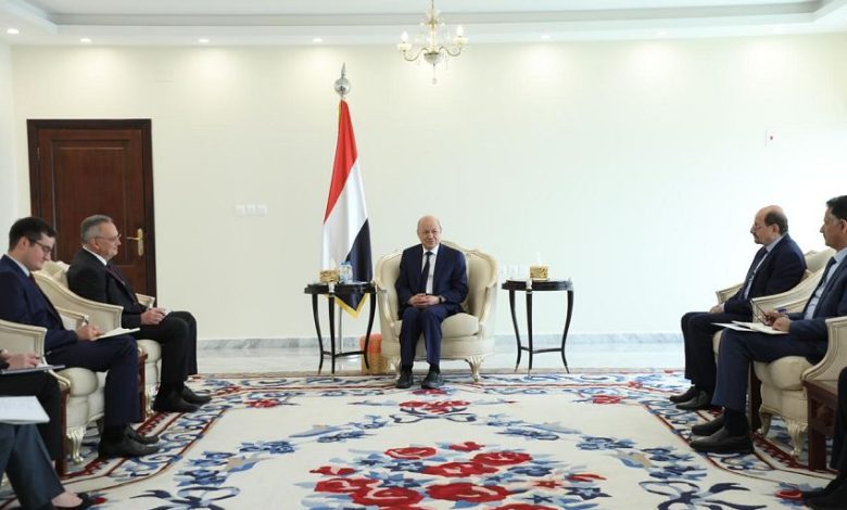 استقبل فخامة الرئيس الدكتور رشاد محمد العليمي، رئيس مجلس القيادة الرئاسي، في قصر معاشيق، اليوم الاربعاء، مدير دائرة الشرق الاوسط وشمال افريقيا بوزارة خارجية جمهورية روسيا الاتحادية، الكسندر كينشاك، والوفد المرافق له.