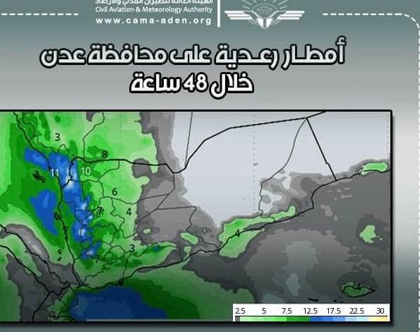 قال مركز التنبؤات الجوية والإنذار المبكر في الهيئة العامة للطيران المدني والأرصاد ” إن مخرجات التنبؤات العددية تشير إلى تأثر محافظة عدن بأمطار رعدية متفاوتة الشدة، ورياح شديدة مصاحبة لها خلال الـ 48 ساعة القادمة، بمشيئة الله تعالى”.