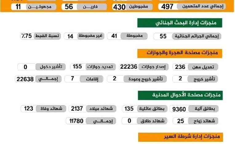 وأشارت إلى أن إدارة البحث الجنائي حققت أداءً لافتاً، حيث تعاملت مع (55) جريمة جنائية وحققت نسبة ضبط بلغت 75%، وتمت إحالة جميع القضايا إلى الجهات المختصة.. مؤكدةً بأن مصلحة الهجرة والجوازات أنجزت (22,638) معاملة، شملت إصدار وتجديد جوازات، وتعديل مهن، وتأشيرات دخول وخروج.