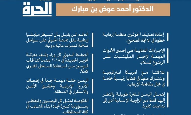 الرئيسية/إنفوجرافيك/إنفوجرافيك | أبرز ما ورد في حديث رئيس الوزراء الدكتور أحمد عوض بن مبارك لقناة الحرة إنفوجرافيك | أبرز ما ورد في حديث رئيس الوزراء الدكتور أحمد عوض بن مبارك لقناة الحرة 26 يناير، 2025 26 يناير، 2025 فيسبوك تويتر لينكدإن Tumblr بينتيريست Reddit VKontakte مشاركة عبر البريد طباعة