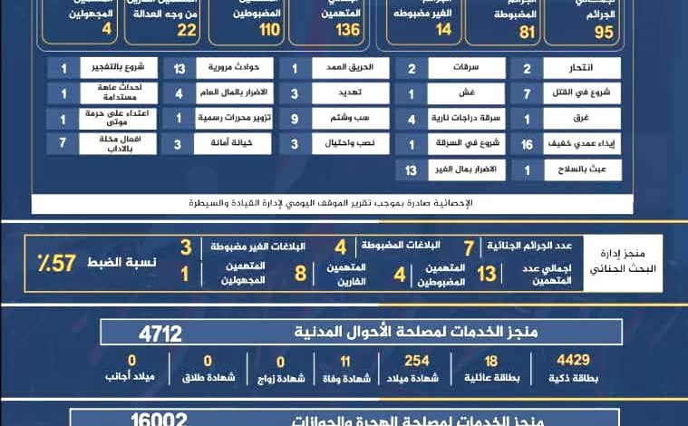 وكشف التقرير عن نجاح الأجهزة الأمنية في ضبط 95 جريمة مختلفة، من بينها جرائم قتل وسرقة واعتداءات، وقضايا حيازة أسلحة غير مرخصة، والتعامل مع 14 جريمة غير مضبوطة، حيث يجري العمل على استكمال إجراءات التحقيق وملاحقة الجناة.