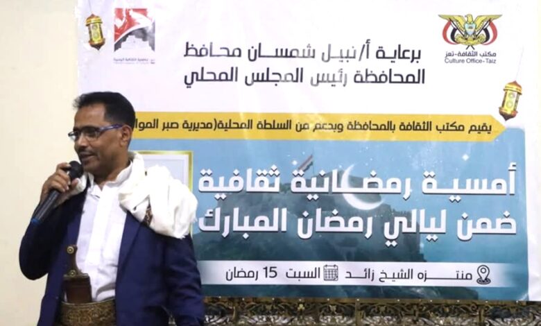 نظم مكتب الثقافة بمحافظة تعز، بالتعاون مع السلطة المحلية بمديرية صبر الموادم، أمسية رمضانية ثقافية في منتزه الشيخ زايد بن سلطان، تحت رعاية محافظ تعز شمسان، بحضور عدد من المسؤولين التنفيذيين والأكاديميين والشخصيات الاجتماعية والثقافية، إلى جانب ناشطين حقوقيين وإعلاميين.