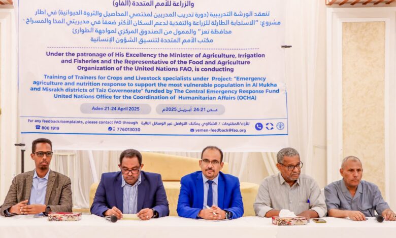 بدأت بالعاصمة المؤقتة عدن، اليوم، فعاليات ورشة تدريبية لمدربين (TOT) لمختصي المحاصيل والثروة الحيوانية، ضمن مشروع الاستجابة الطارئة للزراعة والتغذية لدعم السكان الأكثر ضعفاً في مديريتي المخا والمسراخ بمحافظة تعز، بتمويل الصندوق المركزي لمواجهة الطوارئ التابع لمكتب الأمم المتحدة لتنسيق الشؤون الإنسانية (OCHA).