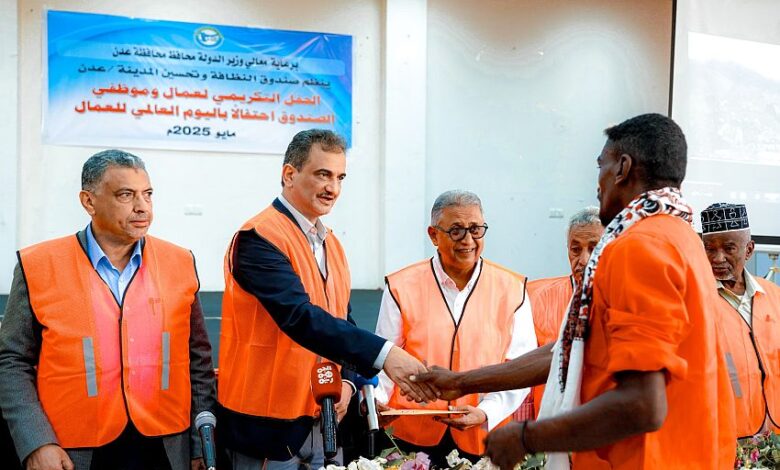 وزير الدولة محافظ عدن يكرّم العمال المبرزين بصندوق النظافة والتحسين بمناسبة عيد العمال