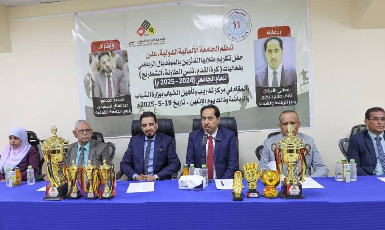 وزير الشباب والرياضة يكرم الطلاب الفائزين في المسابقات الرياضية بالجامعة الألمانية بعدن