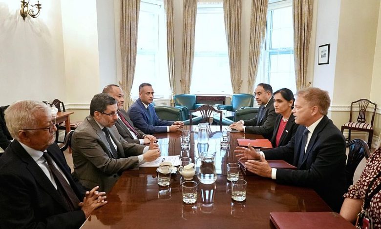 بحث رئيس مجلس الوزراء الدكتور أحمد عوض بن مبارك، اليوم، في العاصمة البريطانية لندن، مع وزير الدفاع البريطاني غرانت شابس، التطورات في اليمن والمنطقة، ومجالات الدعم والتعاون الثنائي في مجال الدفاع بين اليمن وبريطانيا.