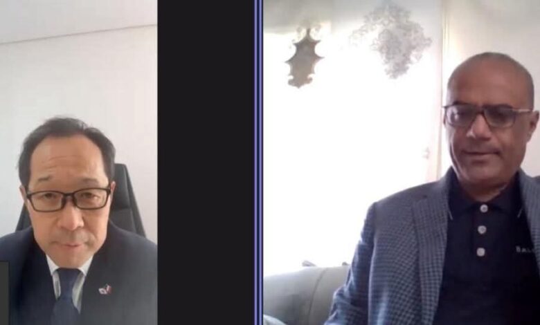 بحث وزير التخطيط والتعاون الدولي الدكتور واعد باذيب، اليوم، عبر تقنية الاتصال المرئي، مع سفير اليابان لدى اليمن, يويتشي ناكاشيما، تعزيز العلاقات الثنائية بين البلدين الصديقين وسبل تعزيزها وتطوير في مختلف المجالات.
